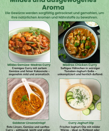 Diese Komposition bietet ein angenehm mildes, dennoch vollmundiges Geschmacksprofil. Perfekt für alle, die feine indische Aromen lieben, ohne starke Schärfe.