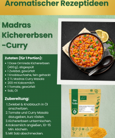 Gemüse oder Hähnchen anbraten, mit Kokosmilch und 1–2 TL Madras Curry Masala köcheln lassen.